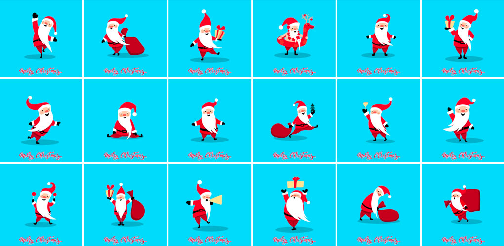 Иллюстрации созданы вручную и переведены в цифровой формат, предлагая разнообразные цветовые решения и размеры. В наборе вы найдете изображения Санта-Клауса в разных ситуациях и позах.